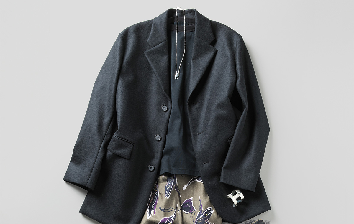 ゆったりとしたビッグシルエットが存在感を放つ、シングルボタンのジャケット型コート。華やかさと洒落感が欲しい日は、モダンなフラワー柄のナロースカートに、首つまりのカジュアルな黒ロンTを合わせたフェミニンな着こなしにさらりと羽織って、センスよく着映えさせて。旬のアウターひとつで大人の余裕が漂う装いに昇華できる。足元は気取らないフラットシューズがちょうどいいバランス。
