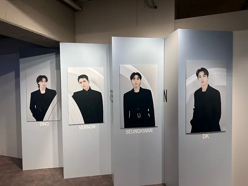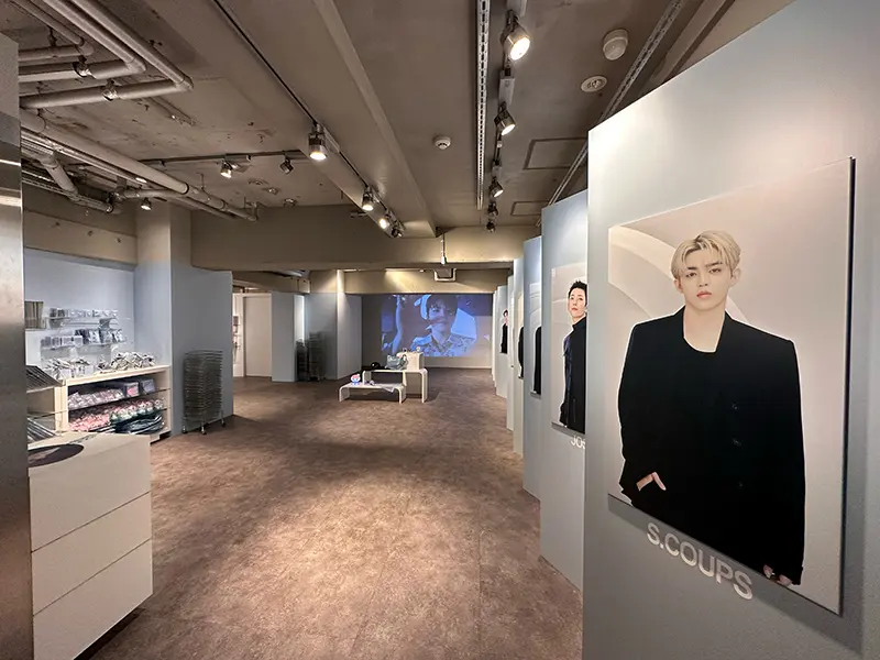 店内には今回のライブのために撮り下ろされたメンバーの肖像がずらり! 奥にはSEVENTEENのミュージックビデオが壁一面に映し出されています。