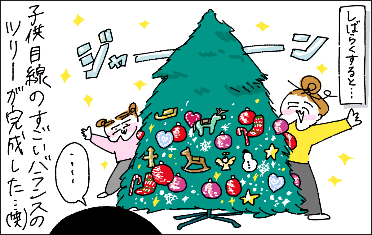 ホリデーシーズンが大好きな作者・カミナカケロヨンさんがクリスマスツリーの飾り付けをお子さんたちに委ねたところ、まさかの仕上がりになったそうで…。