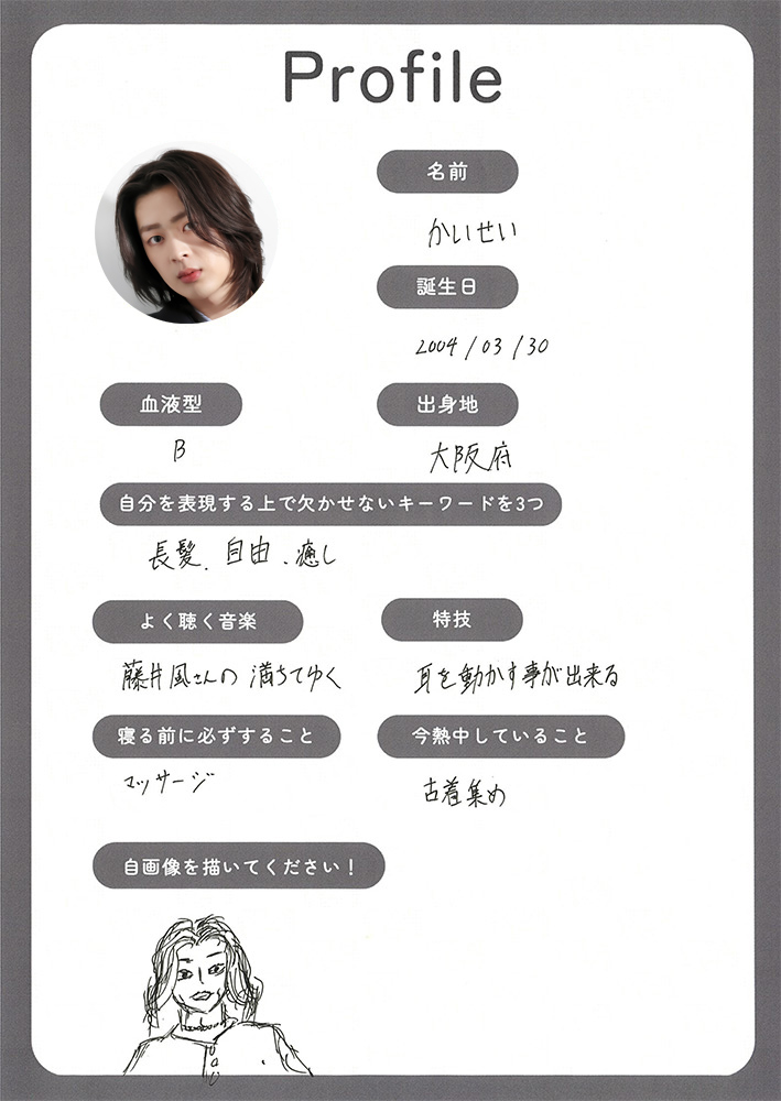 カイセイ:21歳。大阪出身。チャームポイント:えくぼ