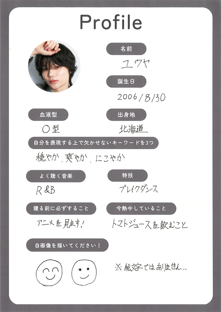 ユウヤ:19歳。北海道出身。チャームポイント:笑った時にくしゃっとなる目