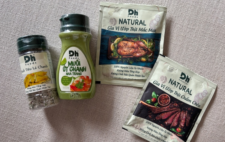ベトナムのスパイスブランドDhフーズの調味料は、リアルに使いそうなものをスーパーで厳選。左から、レモンリーフペッパーソルト、ライムグリーンチリソース。右のふたつはマリネ用のシーズニングで、ベトナム北部のランソン風ローストダックとスパイスミックスです。