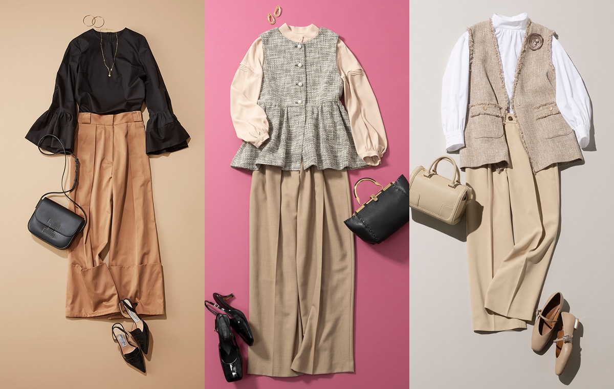 ベージュワイドパンツ×ピンクブラウス×ツイードジレ
