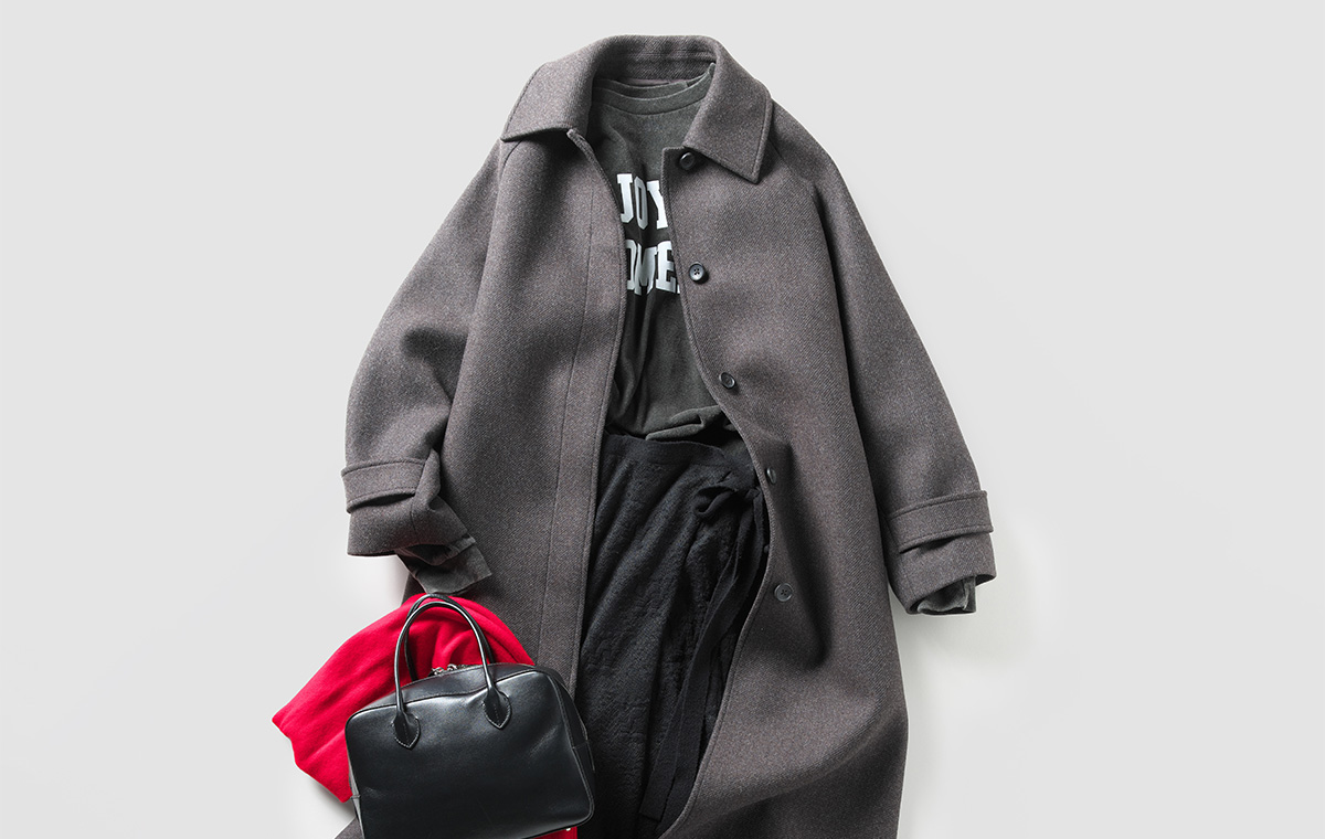「なんだかおしゃれ♡」を叶えるには〝意外性〟が肝。フェミニンなアウターを選びがちなIラインコーデに、あえてメンズライクなステンカラーコートを合わせ、さりげなくセンスのよさをアピール。グレーに引き立つスウェットのロゴや、ジャガード編みのラップスカートの上品な透け感も、冬のモノトーンコーデを表情豊かに仕上げるエッセンスに。