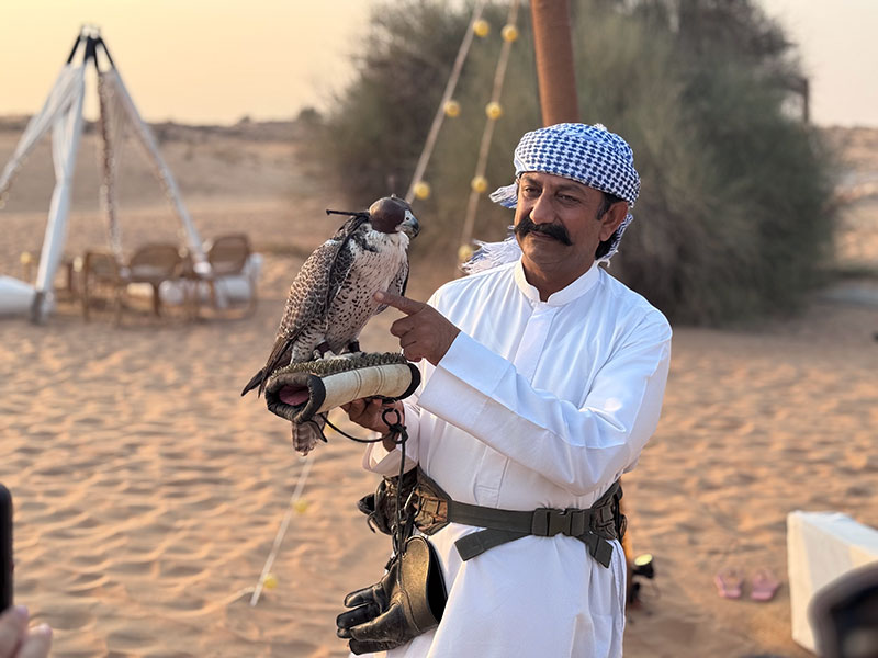 写真は鷹匠のおじさん。席に座っていると「触ってみるか?」と近寄ってきてくれました。鷹はドバイの人たちが長く親しんできた動物。ちなみにドバイのお土産屋さんには鷹のぬいぐるみも売っていたので、ぜひゲットしてください!空港にもありました。