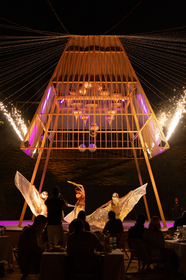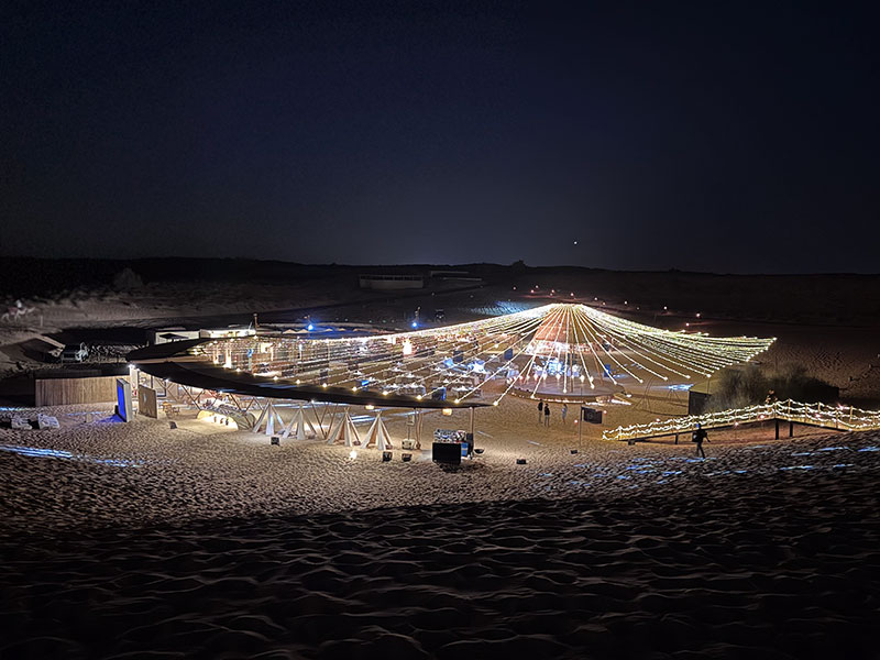 ディナーはテーブルと椅子がセットされた砂漠レストランでショーを観ながら!砂漠に煌めく夕食会場が現れました。