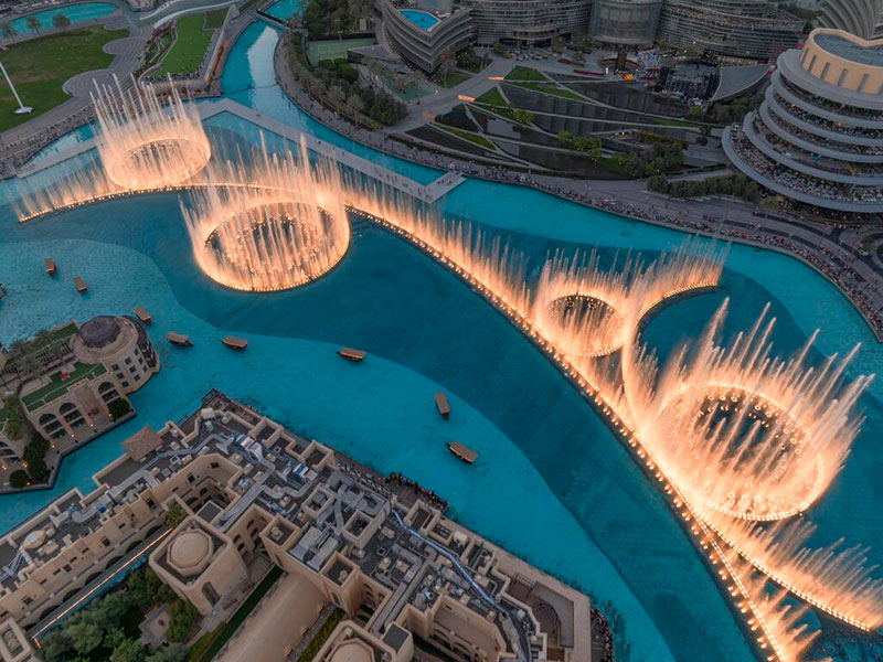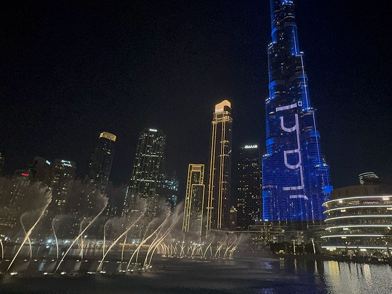 忘れてはいけないのがドバイ・ファウンテンという噴水ショー。ドバイ・モールの目の前で行われるのですが、なんと世界一高いビルのバージュ・カリファにプロジェクションマッピングされています。規模がすごすぎる!