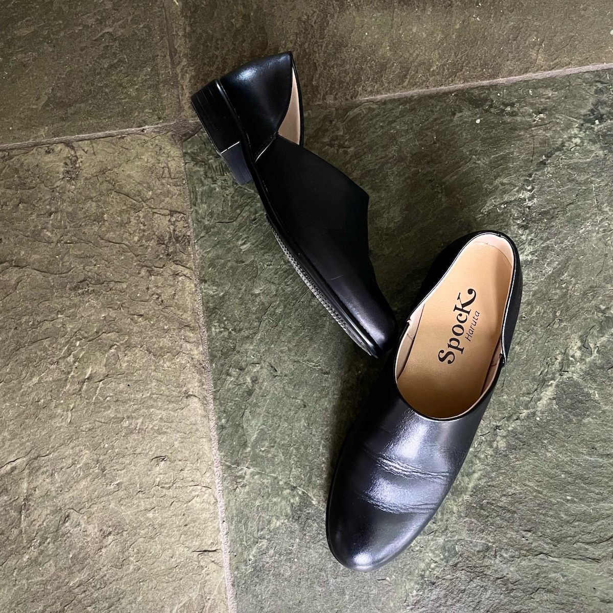 こちらが、私が出張に履いていったハルタの「スポックシューズ」です!足の甲とかかとを覆う部分が分かれていて、両サイドがV字に開いた構造が特徴。洗練されたデザインながら、なんと誕生70周年というから驚きです!「スポッと履けて、スポッと脱げる」から、この名前が付いたというのもかわいいエピソード。