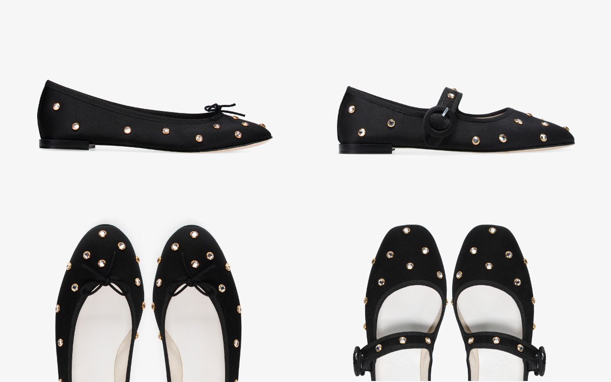 フラットなバレリーナシューズ「Cendrillon(サンドリオン)」とメリージェーン「Georgia(ジョージア)」、人気の2型が繊細なラインストーンを纏ってお目見え。