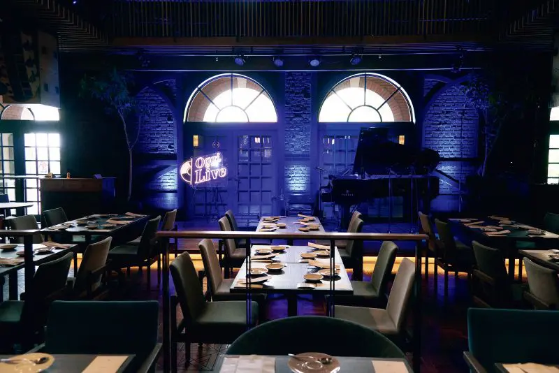吹き抜け2階建てで開放的な空間が広がっている「BLUE NOTE PLACE」。当日は、コースまたはビュッフェ料理やドリンクも提供! 心地いい音楽とトークとともに、五感でスペシャルなライブイベントを体感できます。