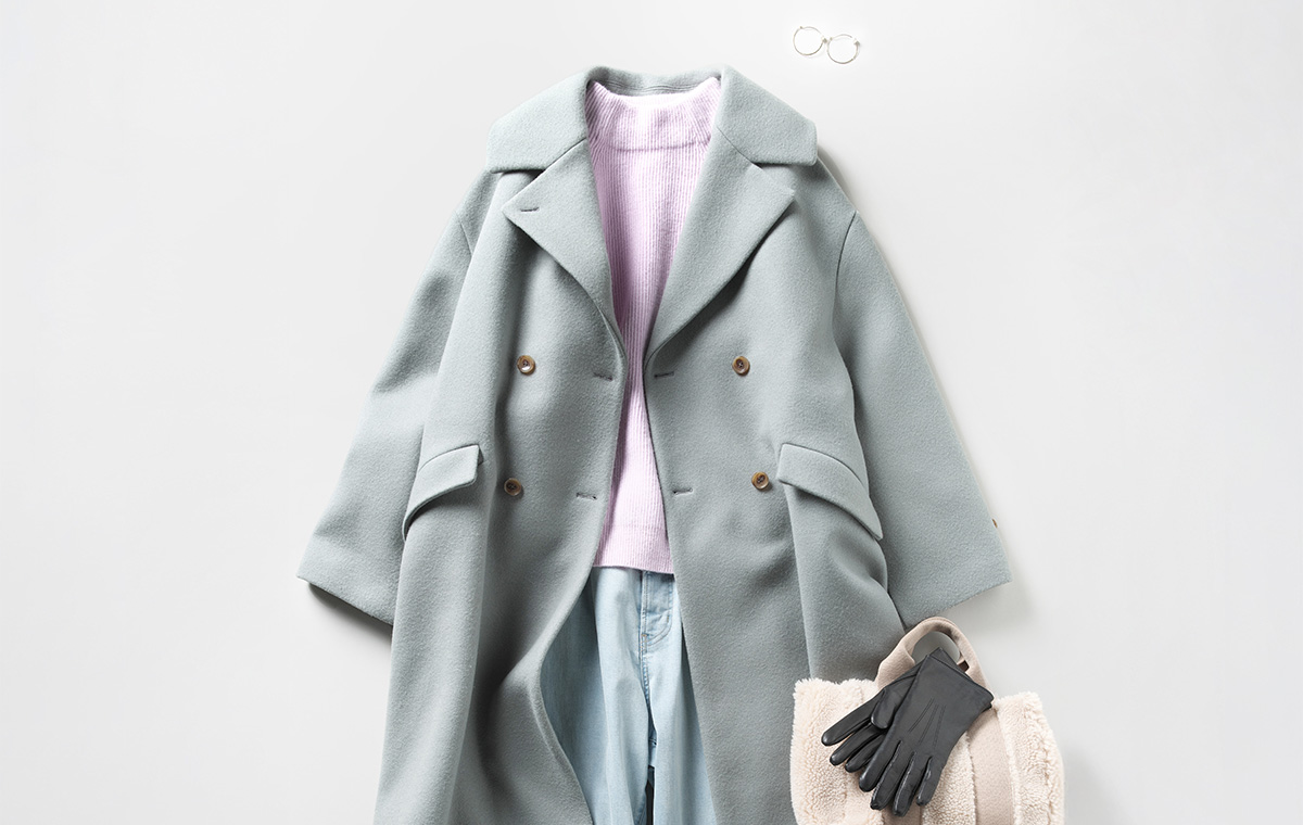 コート¥121,000(マービン&ソンズ〈ワイエムウォルツ〉) ニット¥8,250(アバハウスインターナショナル オンラインストア〈アバハウス マヴィ〉) パンツ¥9,990(オンワード樫山〈アンフィーロ〉) バッグ¥24,200(モンテグラート〈ヴィオラドーロ〉) 靴¥68,200(ハーモニープロダクツ オンラインストア〈マラ ビーニ〉) グローブ¥48,400(真下商事〈デンツ〉) ピアス¥16,5000 (イヴェット)