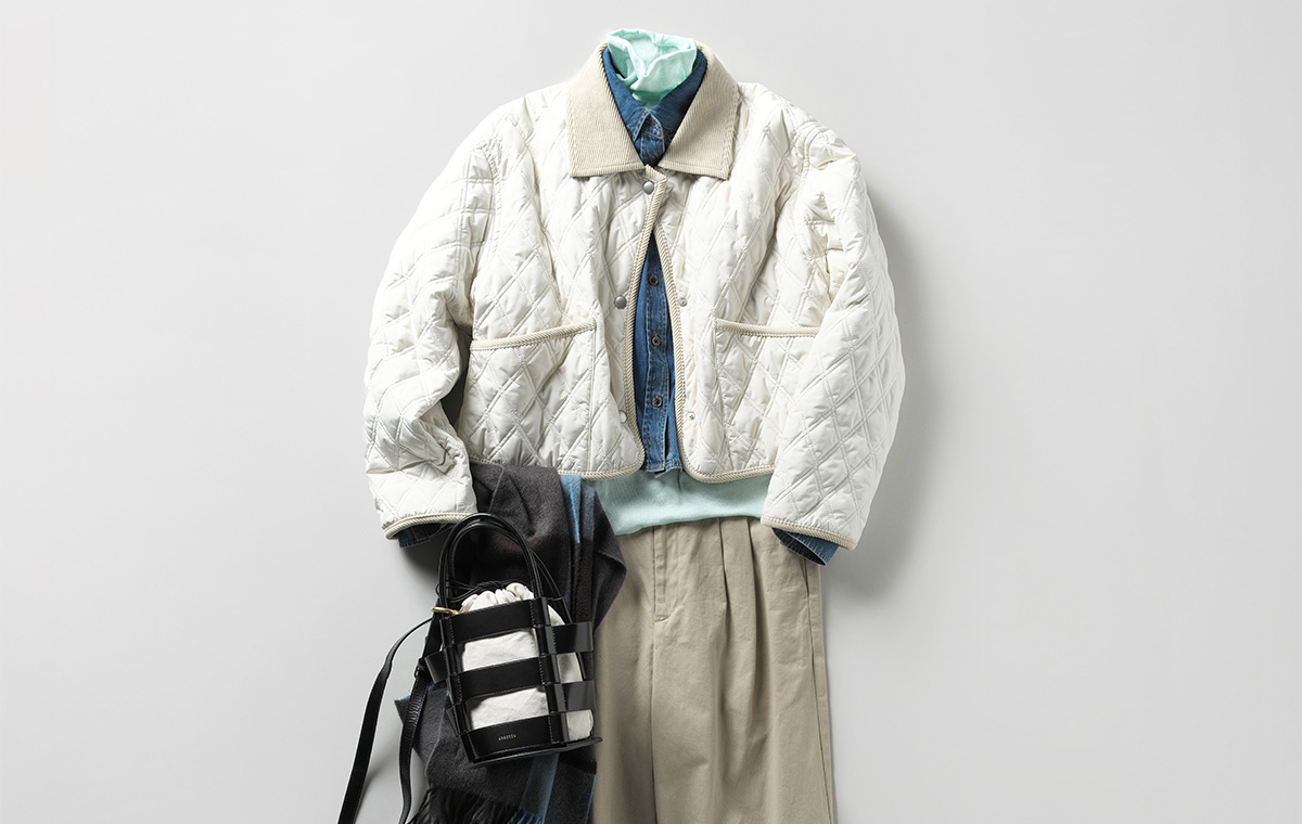 厚着になりがちな冬は、上半身をコンパクトにまとめることでメリハリをつけて。チェック柄を表にしても着られるショート丈のキルティングジャケットと、同じく短め丈のデニムシャツ。ボトムスには重心重めのワイドチノパンを合わせて、すっきりとスタイルよく。シャツから少量のぞかせたミントカラーのシアータートルニットが、爽やかな甘さのスパイスに。