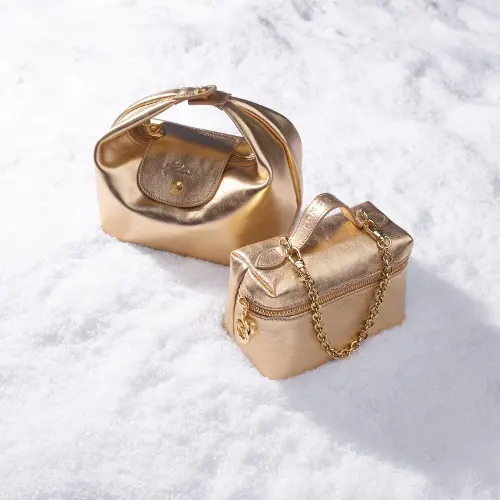 夜のお出かけに映える、光沢のあるゴールドのレザーを使用した「ル プリアージュ® エクストラ ゴールド」。メタリックな輝きを纏ったレトロシックな雰囲気のバッグが、夜の装いをスタイリッシュに演出します。