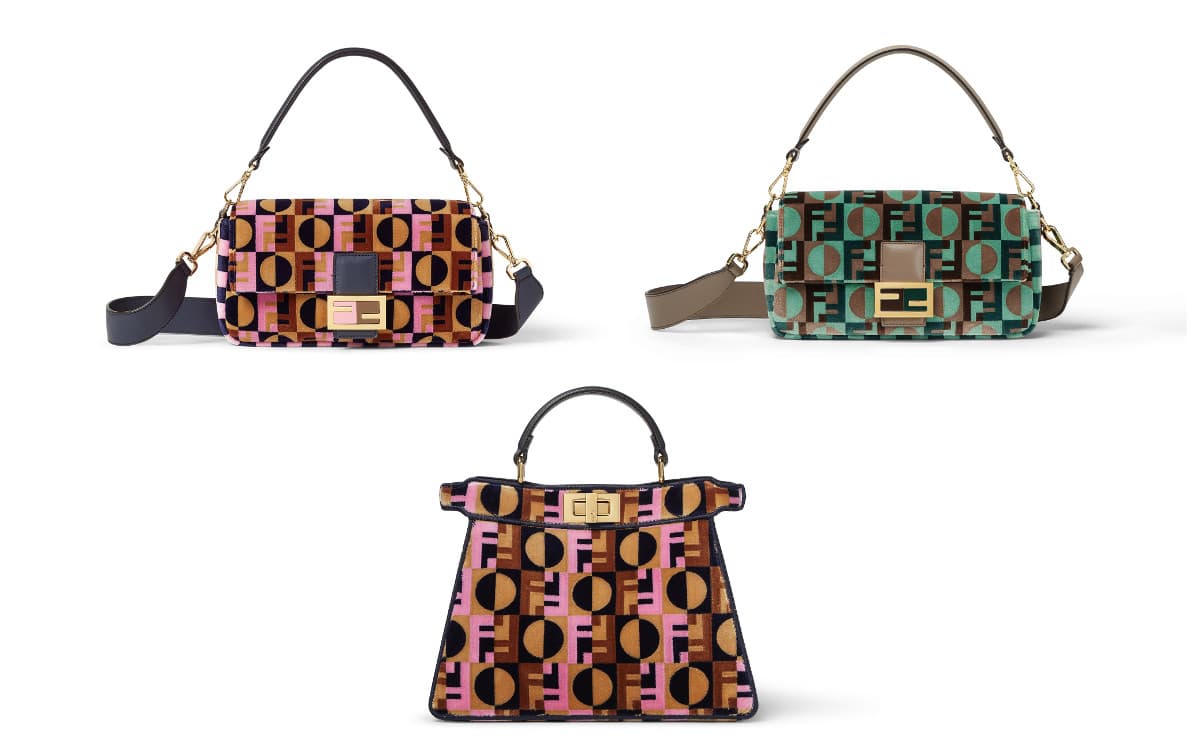 アイコニックな「FF」ロゴとアールデコ調の水玉模様を融合させた「フェンディ ドット」モチーフを描いた、美しいタペストリー効果のある生地を使用。カラーはブラウンとピンク、「バゲット」バッグはダブとミントグリーンも加えた2色で展開します。