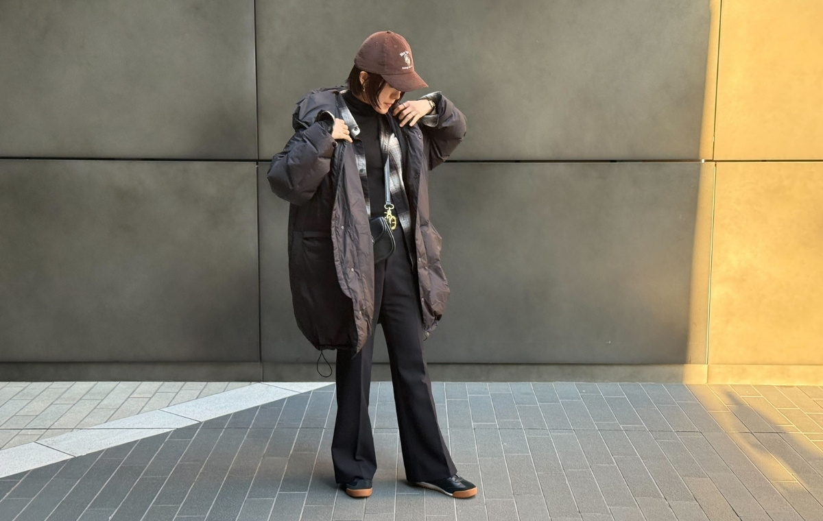 一見普通の黒ダウンに見えるものの、肩周りのステッチラインや程よく抑えられた、控えめな生地のツヤ感。それらすべてが普通っぽいのに、なんだか普通でない…そんな大人の洒落感を醸し出してくれるので、私の“冬の制服”的なタートルニット×デニムコーデの上にただ羽織っても、まあおしゃれ!