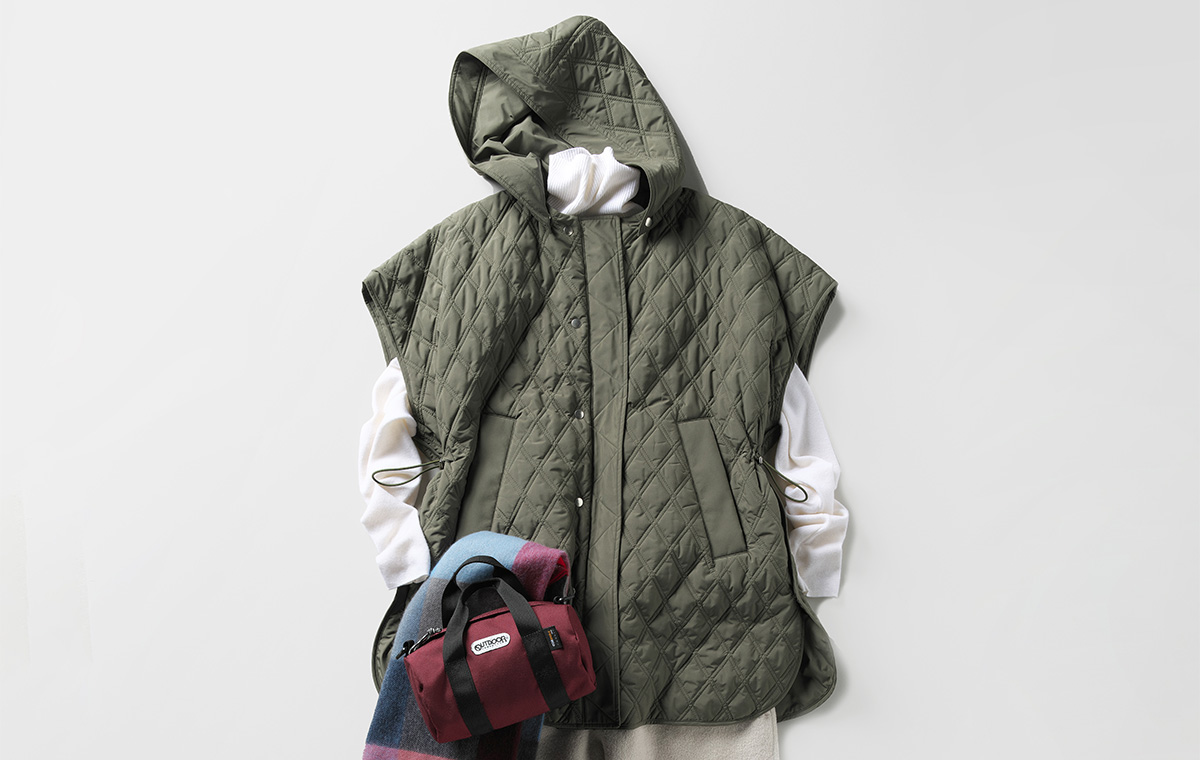 週末は子供の習い事の送迎で午前中からバタバタ…。そんな休日を支えてくれる、ハイスペックなポンチョが主役。撥水、防風などの機能に加え、保温性も高く軽い着心地。表はキルティング、裏はツルンとしたタフタのリバーシブル仕様で、フードを外したり、サイドのスナップボタンやウエストのドローコードでシルエットを自在にアレンジできる。タートルニット×ウール調ジャージーパンツのホワイトコーデをカーキで引き締め、ほんのり辛口に導いて。