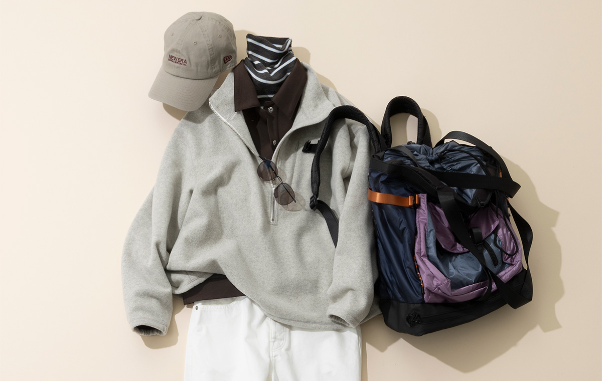 注目のフリースで、スポーティコーデをぐっと今っぽく! カジュアル感強めのフリースは、しっとりとやわらかい素材のライトグレーなら大人っぽく上品。ファスナーを大きく開け、インにはボーダーのタートルニットとブラウンのポロニットを重ねて、さらに着こなしを活性化して。ボトムスは白のデニムパンツを合わせ爽やかに、落ち着いたトーンでまとめあげて。