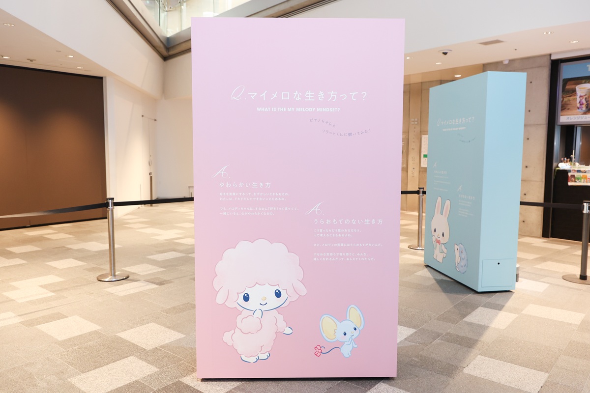会場である表参道ヒルズの吹抜け空間には、マイメロディのお友だちであるピアノちゃんやフラットくんたちが語る「マイメロな生き方」の展示やかわいらしいフォトスポット、長さ約30m×幅約2mのアイコニックな「巨大ウィッシュリスト」の懸垂幕などが設置されていて、訪れた人をワクワクさせてくれます!