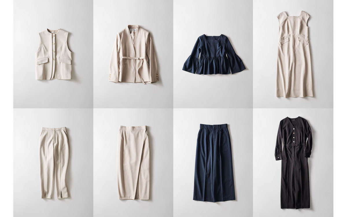 「日常の美しい着こなし」を意識した素材とデザインのシリーズ。レーヨン・ポリエステルの混紡糸を使用して高密度に織り上げる事による、梳毛調のさらりとしたタッチが特徴です。ジャケット、ブラウス、パンツ、スカート、ワンピースをアイボリーとネイビーの2色で展開。