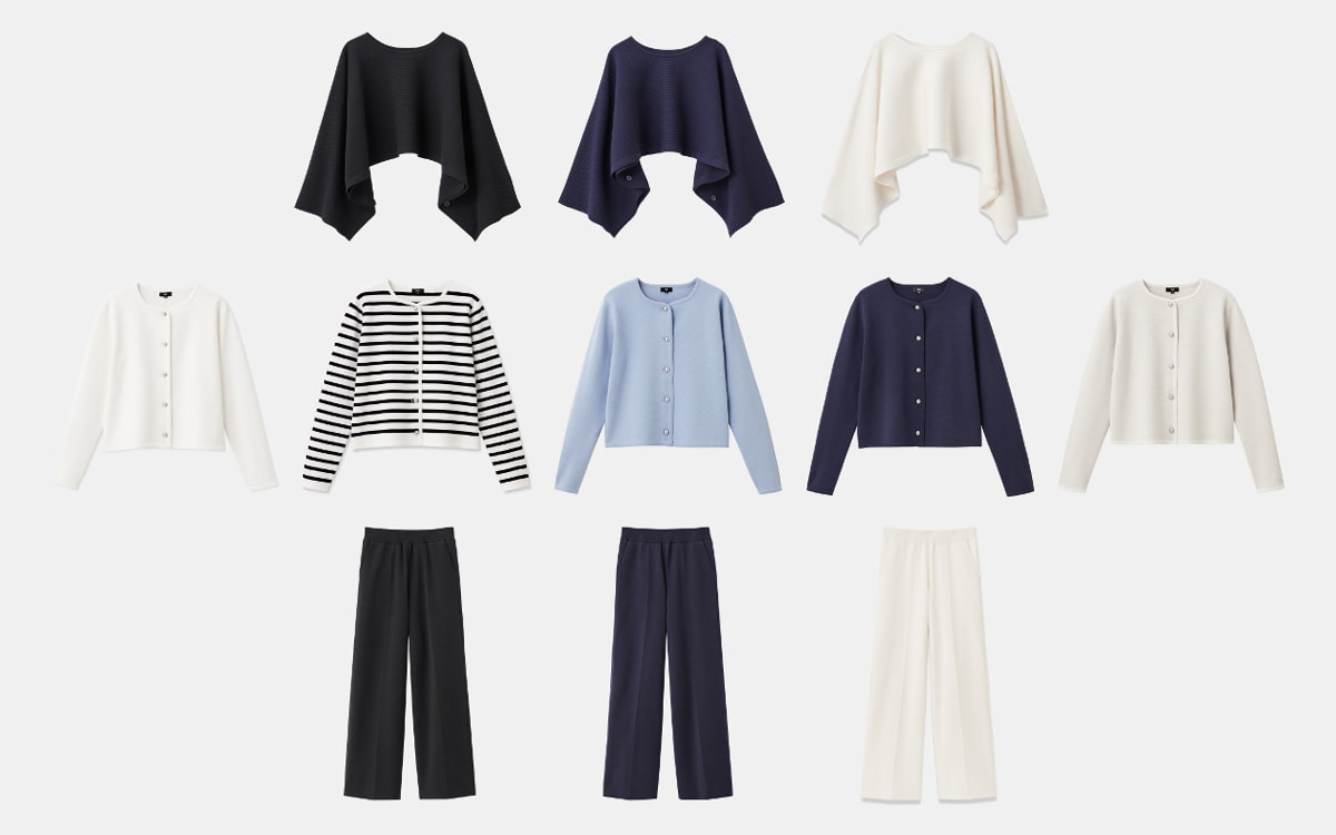 さらっとした肌触りのコットン混素材を使用した「コットンブレンドニットシリーズ」は、冬から春まで季節をまたいで長く着用できるのが魅力のシリーズ。目の詰まったミラノリブ編みによるしっかりとした生地感と上品な表情も特長です。