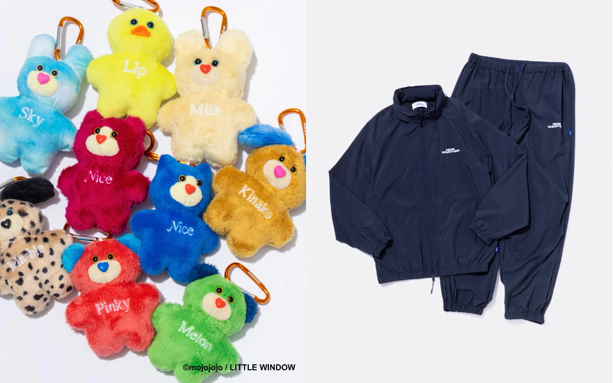 「mojojojo」は、ぬいぐるみ作家の尾崎 歩美さんが手掛ける大人気のぬいぐるみブランド。今回“NICE WEATHERのバッグに「mojojojo」のチャームをプラスしたらさらにかわいい”という思いからコラボが実現しました。アイテムは、「mojojojo」キャラクターのチャーム18種類とTシャツ2種類を展開。新宿店オープンを皮切りに「NICE WEATHER」全店舗とECサイトで発売されます。