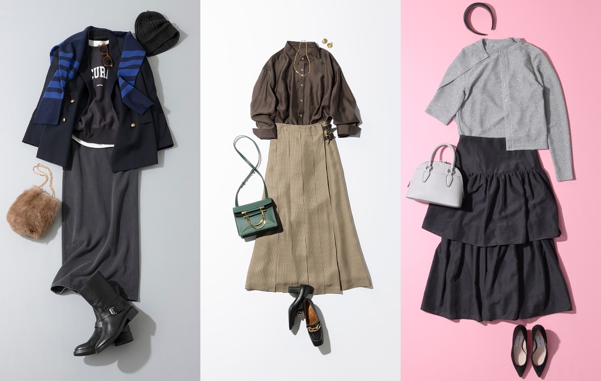 カジュアルトップスは「ツヤ感スカート」できれいめに傾けて
