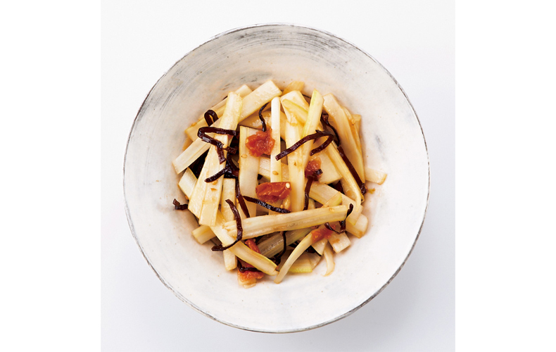 セロリは細切りに。種を除いてつぶした梅干し、ごま昆布の佃煮と和える。