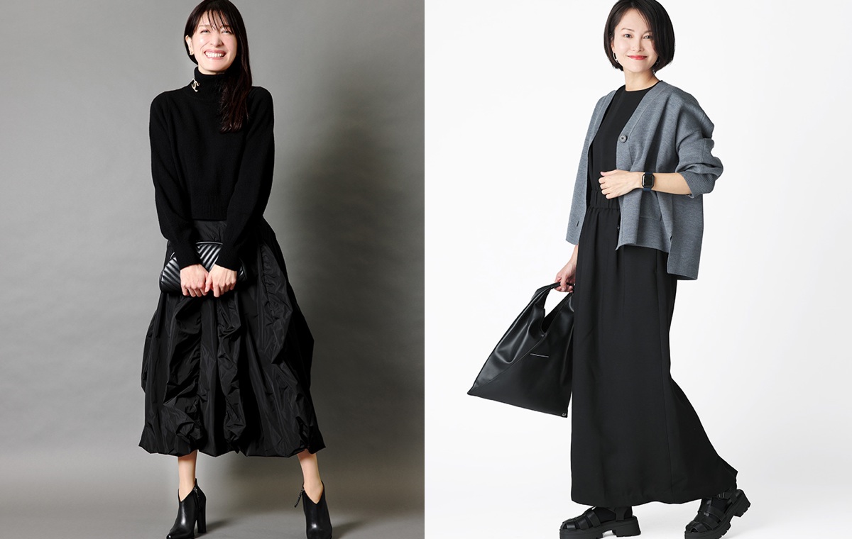「タートルネックでほどよいボリューム感があり、さまざまなボトムスと合わせやすいニットは、コンパクトな丈感が今っぽくてお気に入り。中心にかけてふんわりしたシルエットが特徴のスカートとも相性抜群! オールブラックコーデのときは、デザイン性が高いアイテムを選ぶのがマイルール。シャリ感のあるスカートで異素材を組み合わせたり、ショートブーツで足首をちら見せしたりすることで、野暮ったく見えないよう工夫しています」(Domani読者・飯島美穂さん)
