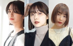カットでしっかり毛流れをつくり、アイロンで巻きすぎなくてもこなれ感が漂う今っぽいセンターパートボブ。前髪を厚くしないことでセンターパートでざっくりとかき上げても軽やかな束っぽさができ、大人っぽくおしゃれなムードがつくれます。カットはあご下でパツッと切りっぱなしに。前髪は鼻ライン、なじむよう顔まわりにつなげひし形シルエットをつくって。