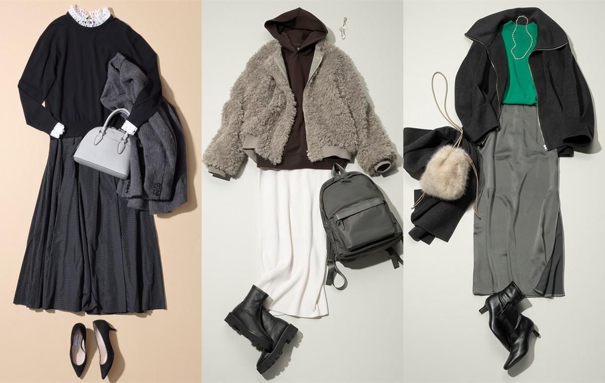 40代からのスカートコーデは、品よく映えさせることがおしゃれに見せるコツ。Iラインやシルエットを意識してスタイリッシュにまとめてみましょう。全体を落ち着いたトーンにすると大人の品のよさを感じさせる着こなしに。