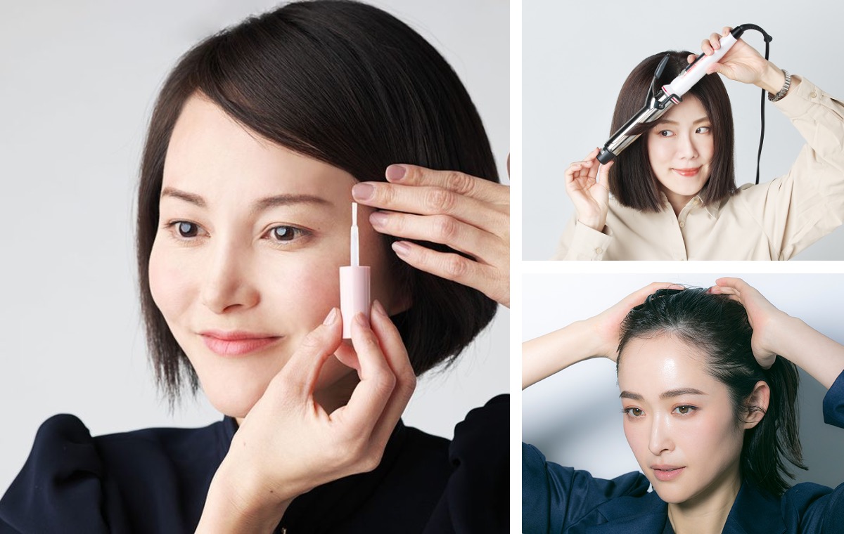 前髪なしスタイルを楽しみたいときは、サイドや表面の長い髪と一緒に分けてまとめる。前髪ありのスタイルを楽しむときは、真ん中の狭くつくった前髪をコテを通し軽く巻く。顔まわりに残した伸ばしかけ前髪は、リバース巻きでしっかりめに巻く。ツヤの出るオイルをほんのりとなじませ、束感のあるシースルーバングにしたら完成。