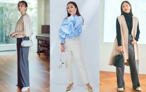 着回しが利く定番の白パンツを今どきに着るなら、クラシカルなトップスが最適。黒の配色と金ボタンがアクセントになったニットカーデからフリルブラウスをちら見せし、エレガントなムードに仕上げて。通勤はもちろん、休日のお出かけにも着映え効果抜群のスタイルに。