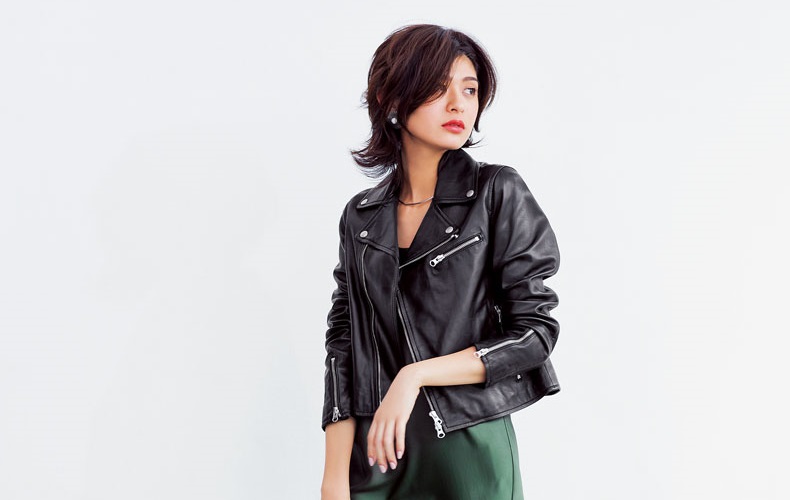 華やかな素材で着こなしにモードな味つけを。辛口なライダースをサテンでセンシュアルに。ツヤっぽいサテンワンピース、それもグリーンのようなナチュラルな色を、ハードな黒ライダースに合わせることで、おしゃれ上級者の貫禄が。かっこよくて色っぽい!