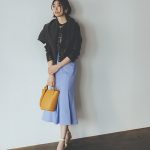 ふんわり広がるスカートには、ほどよくフィット感があり、縦ラインが強調されたトップスが好相性。甘さが強めにも感じる花柄スカートは、上品な柔和さを感じるカラーでまとめて大人っぽく。