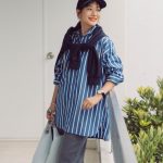 キリリと潔いブルーストライプのビッグシャツに、裾のスリットが脚を長く見せるニットジョガーパンツでバランスよく。ヒップ周りなど気になる箇所を隠してくれるビッグシャツと、ストレスフリーに過ごせるニットパンツのコーデはまさに旅行に最適な組み合わせ。