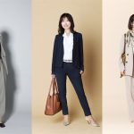 すっきりとしたノーカラーのジャケットとドローストリング付きのテーパードパンツは、通勤やハレの日はもちろん幅広いシーンに活躍。首まわりと袖口の細かいフリルがかわいらしいブラウスで、ほんのり華やかなムードに。