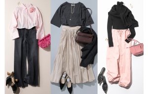 つい合わせる色に悩んでしまうピンクだけど、ブラックなら甘さ控えめにスッキリまとめられる。パンツとカラーリンクさせたピンクのバッグも、黒のパイピングがポイント。こんなさりげないディテールがコーディネートの完成度の高さにつながる。