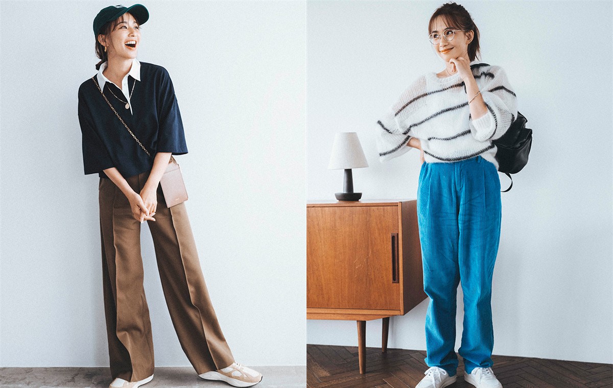 この時期に活躍するスウェットやパーカ。ロゴスウェットの中にボーダートップスをレイヤードした技ありコーデ。カジュアルアイテム同士の組み合わせは、きれいめのブレーパンツで馴染ませて。スニーカーの色味で全体をリフレインさせるのも、コーデに統一感をもたせるコツ。