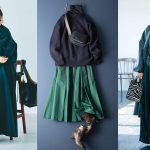 ミントグリーンステンカラーコート×水色ニット×グリーンスカート