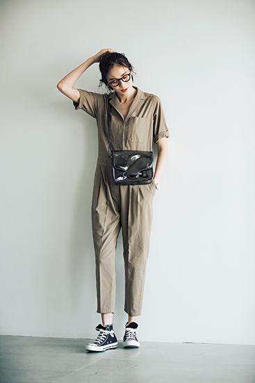 薄い2オンスデニムをサテン織りで仕上げた軽やかで高級感のあるデニムを使用し、ワンウォッシュのネイビーがカジュアルなオールインワンをきれいめに昇華。ボーダーカットソーをインナーに入れ、グリーンのエコバッグをアクセントにして爽やかな着こなしに。