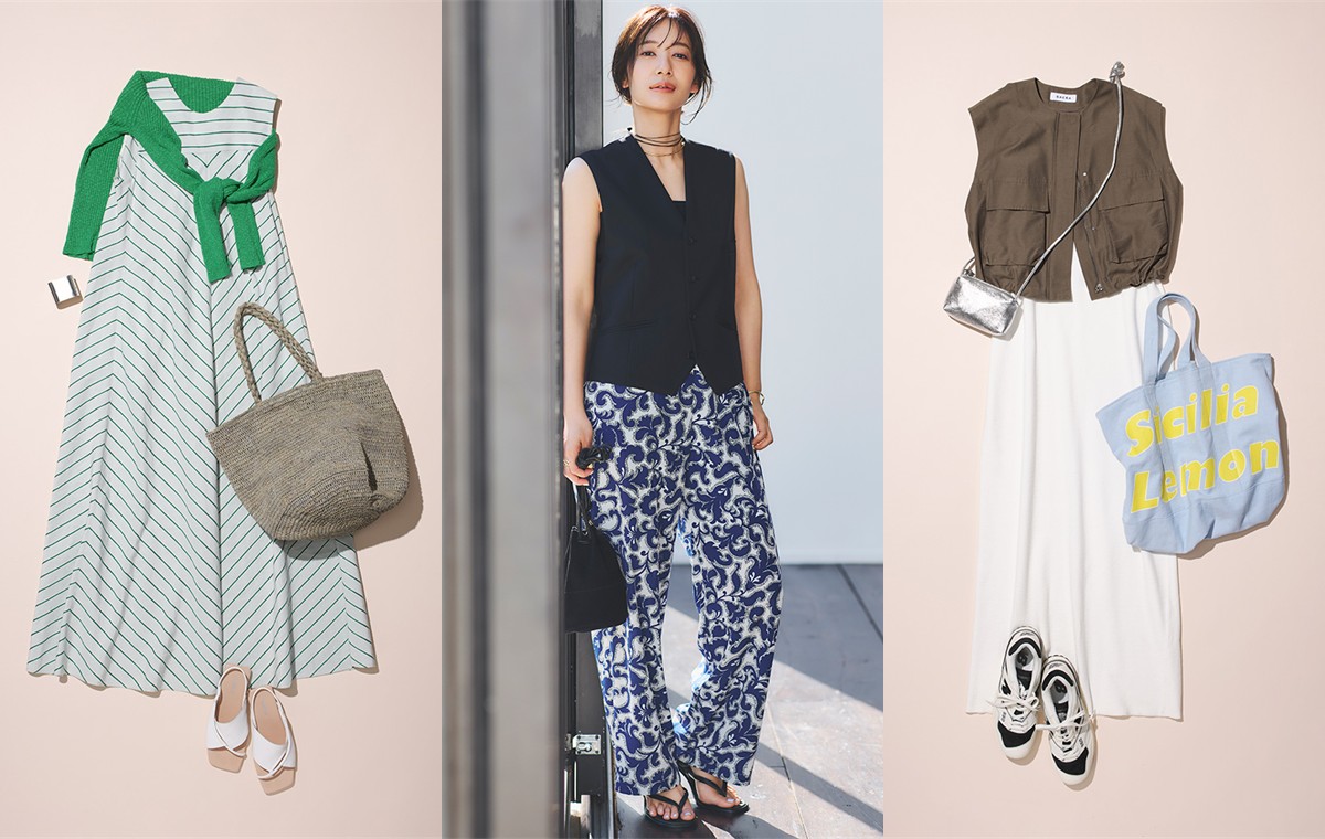 すっきり着られるアメリカンスリーブの白ワンピースに、大きめの立体ポケットがアクセントになった高鮮度ジレをレイヤードしたスポーツミックスコーデ。真夏のシンプルな装いにメリハリが生まれるだけでなく、表情もぐっと今どきに。キャッチーなロゴのトートバッグや、アクセサリー代わりに斜めがけしたミニバッグで、大人の茶目っ気も加えて。