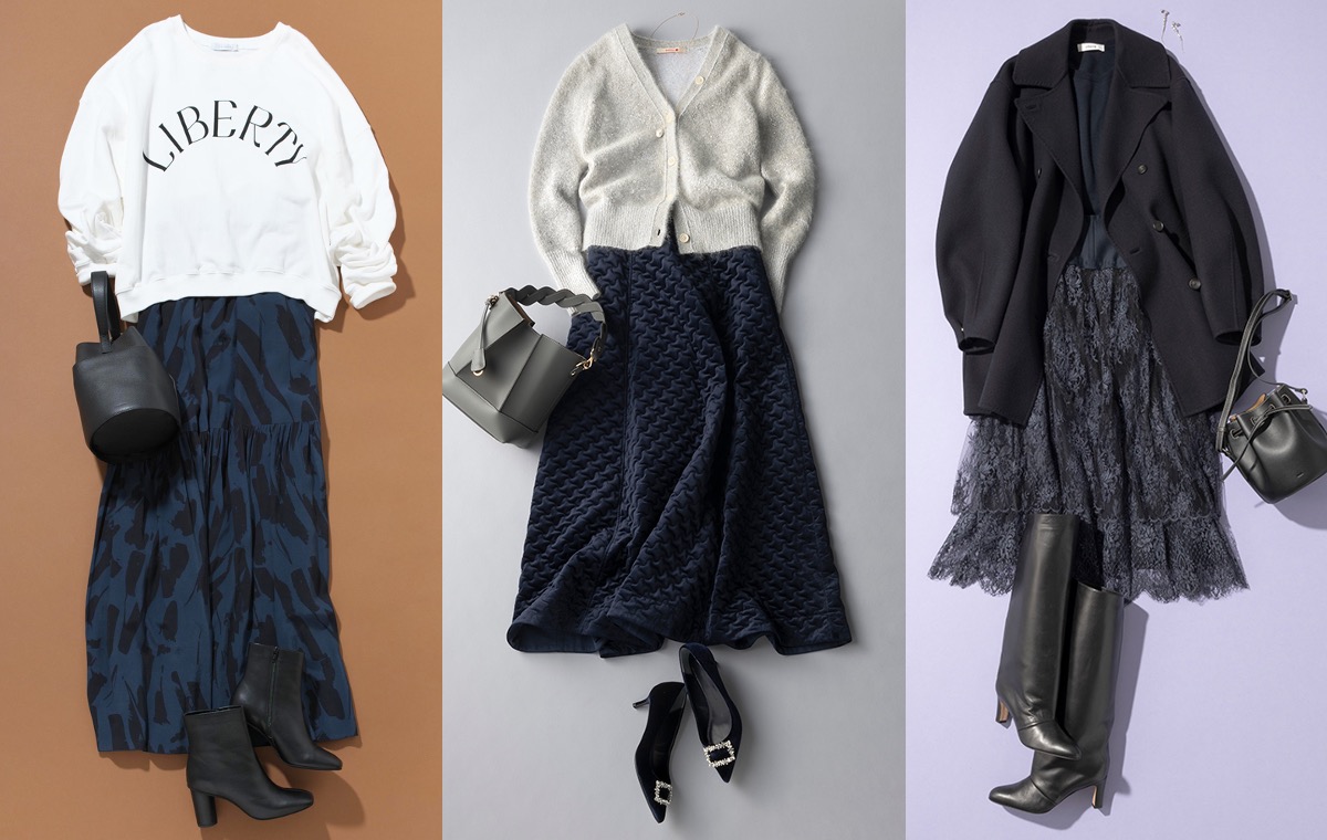 ネイビーは落ち着きがあって上品で知的ムードが漂う、大人のベーシックカラー。そんなネイビーのスカートは、オフィスシーンからオフの日まで、幅広く使える万能アイテムです。いつものワードローブをアカ抜けて見せるなら、ワントーンコーデがおすすめ。また、白を差し色に使うと爽やかな抜け感をプラスできます。